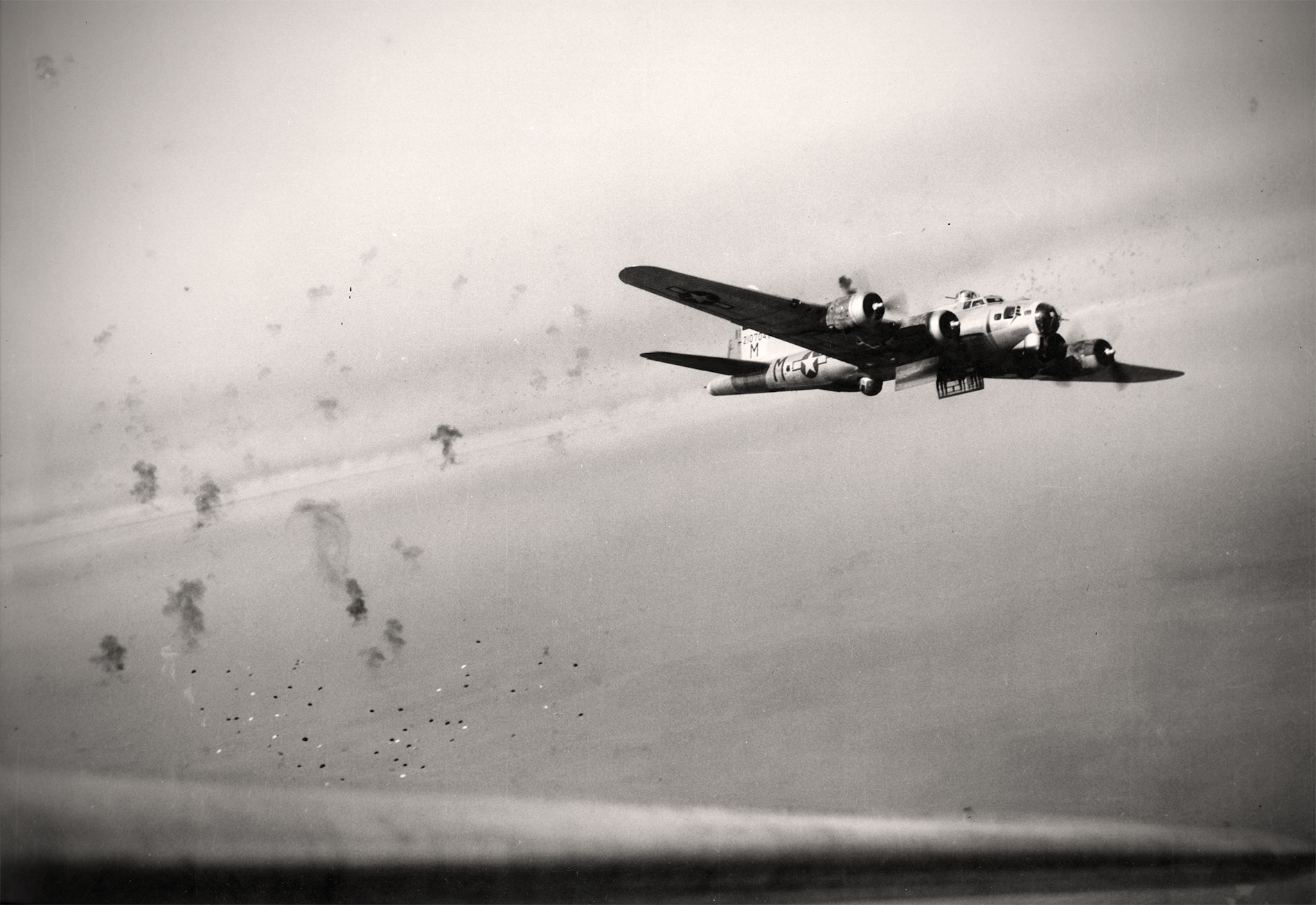 18 września 1944 r. Latające Fortece Boeing B-17G podczas lotu nad Warszawę ostrzeliwane przez niemiecką artylerię przeciwlotniczą. Zdjęcie wykonane przez amerykańskiego lotnika z pokładu B-17 Z 95 Grupy Bombowej podczas operacji „Frantic 7”.