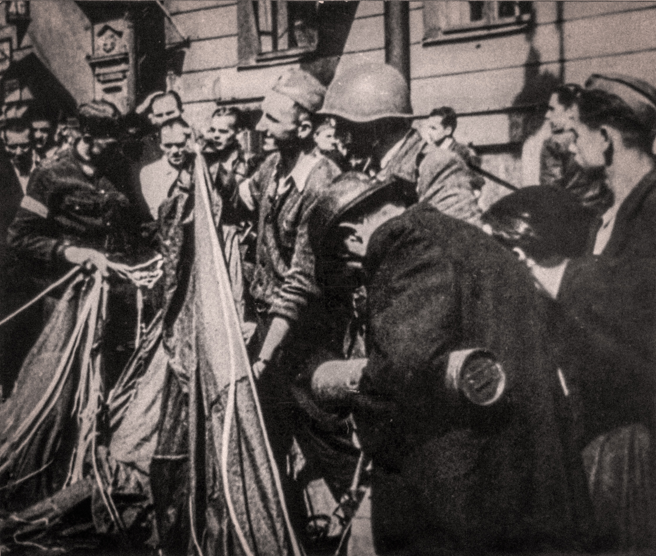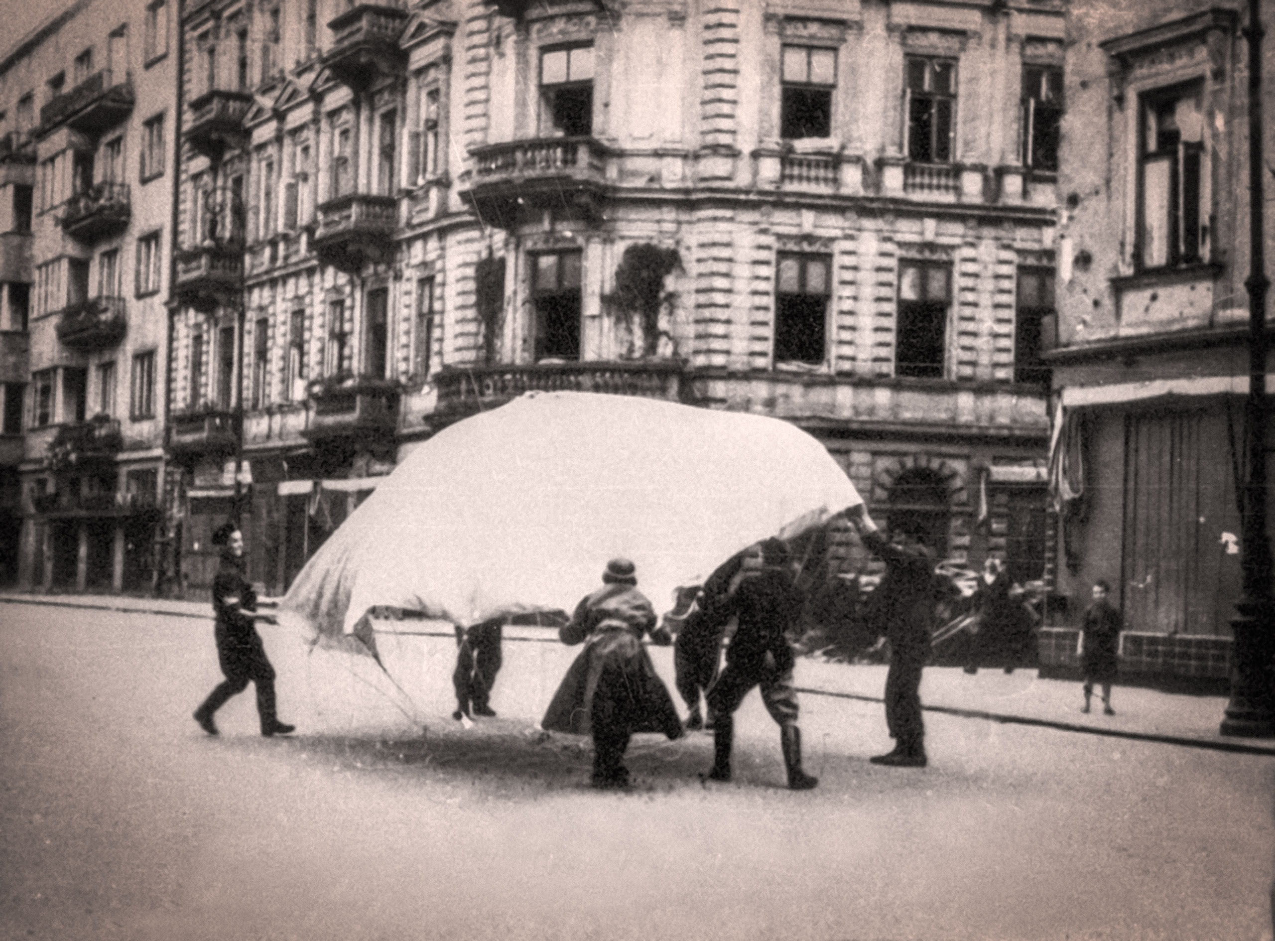 Fotografia z Powstania Warszawskiego. 18 września 1944 r. Śródmieście Północne. Przyjmowanie zrzutu na ulicy Brackiej u zbiegu z Chmielną (po prawej) i Szpitalną (po lewej)