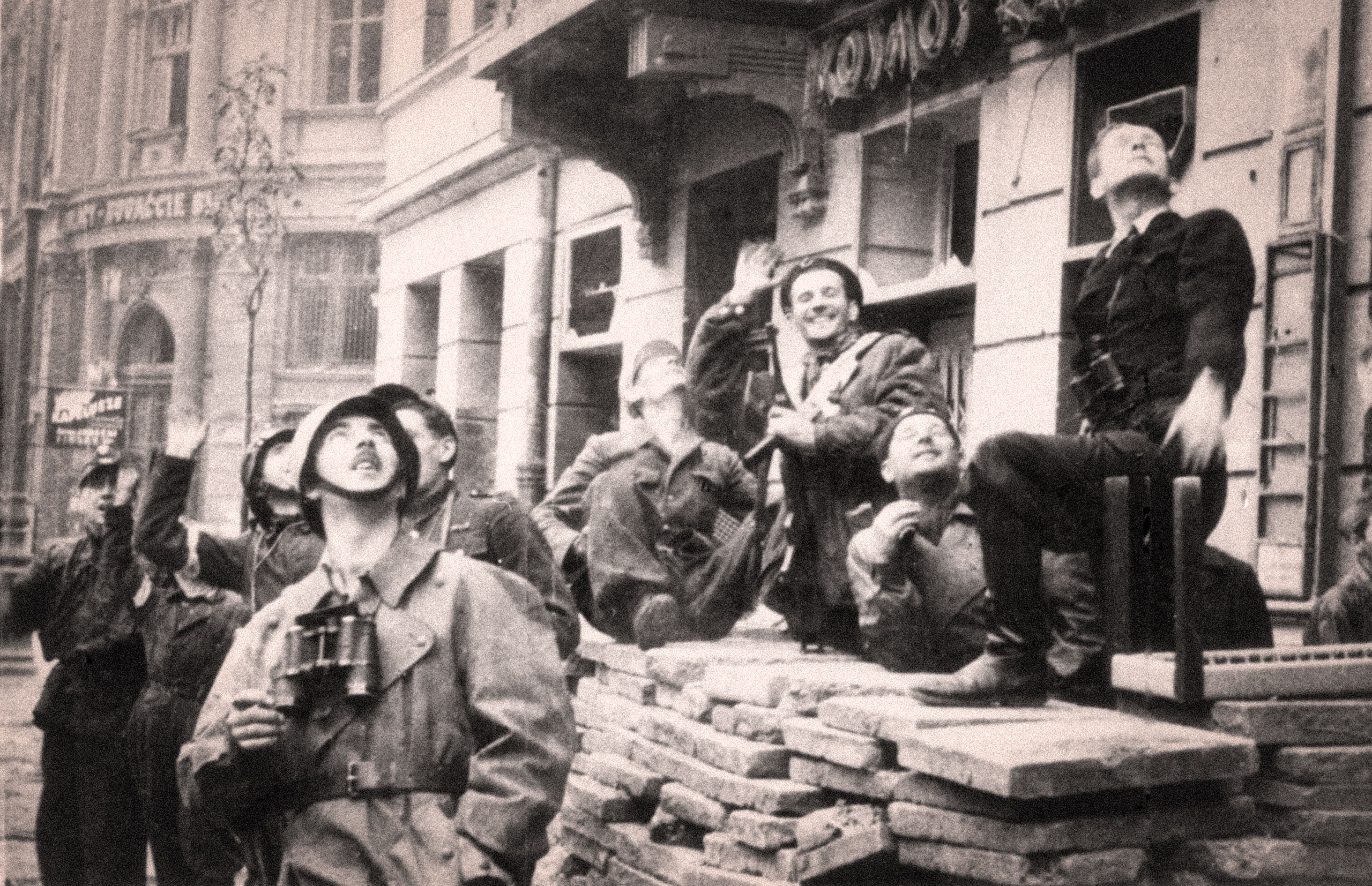 Fotografia z Powstania Warszawskiego, 18 września 1944 r. Śródmieście Północne. Powstańcy z oddziału AK mjr. „Barry” zgrupowanie „Sosna” przed kwaterą na ul. Zgody róg Złotej oczekują na amerykański zrzut (operacja Frantic 7).