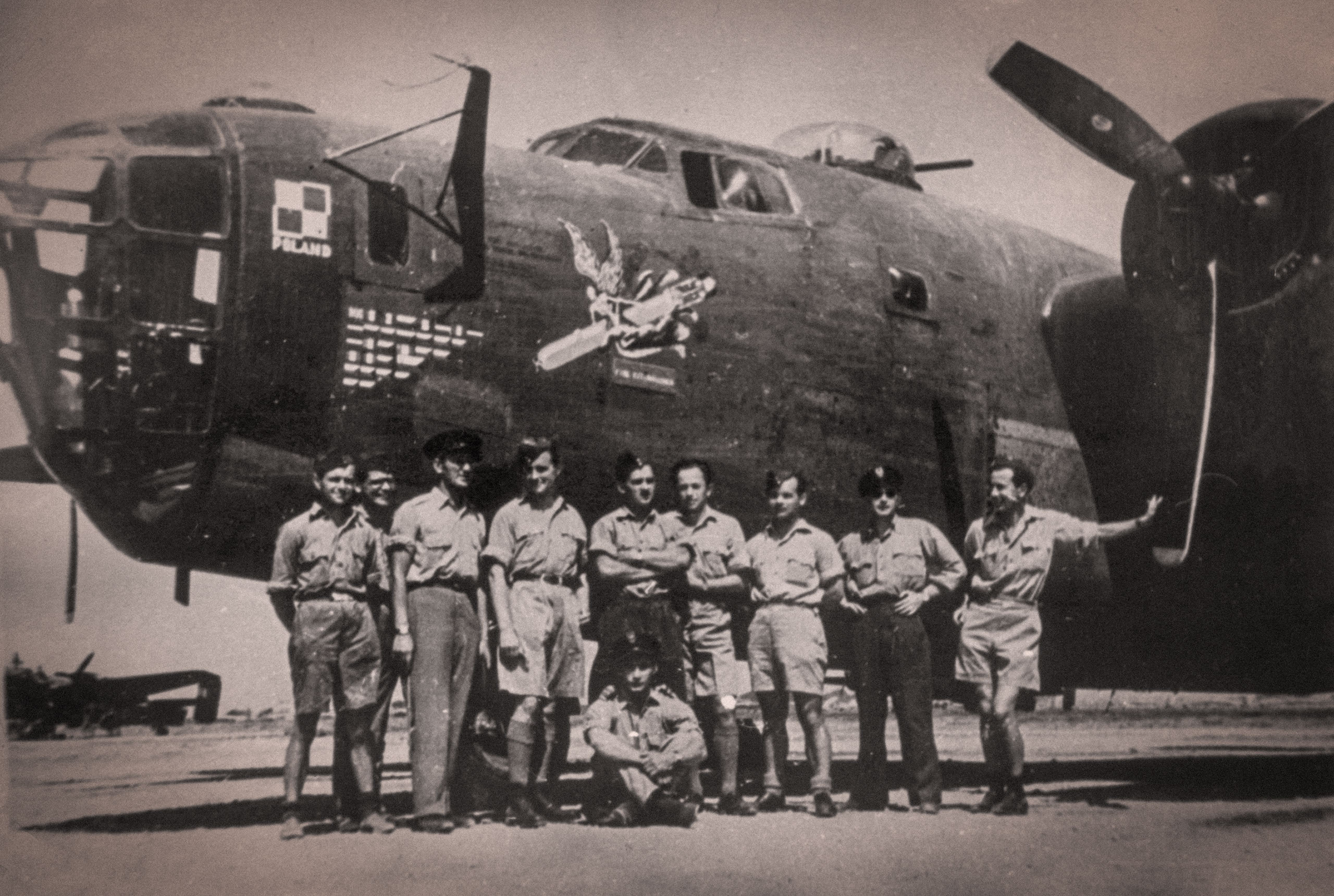 Fot.3. Włochy, 1944. Lotnisko RAF w Campo Casale koło Brindisi. Polska załoga samolotu bombowego B-24 Liberator GR-S BZ965 kpt. Zbigniewa Szostaka (siedzi) z 1586 Eskadry Specjalnego Przeznaczenia.